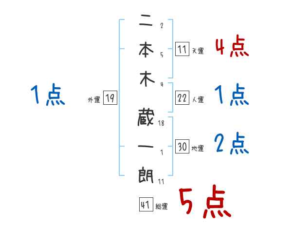 天運![]() | 二本木蔵一朗さんの天運は11画の4つ星!着実に富や地位を得る幸運な人生。 家系が持つ宿命的な運勢を表します。祖先から受け継いだ苗字ですので自分の力が及びません。家柄を象徴します。 |