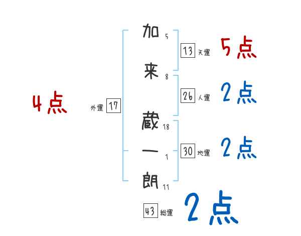 外運![]() | 加来蔵一朗さんの外運は17画の4つ星!積極的な行動力。地位を気づき財産を手に入れる。純粋な心と直感力。 生活面を象徴する運勢です。外部から受ける影響力を表し、結婚運、家庭運や職場、環境への順応性を表します。 |