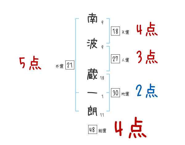 天運![]() | 南波蔵一朗さんの天運は18画の4つ星!情熱的で剛気。忍耐力があり信頼される。 家系が持つ宿命的な運勢を表します。祖先から受け継いだ苗字ですので自分の力が及びません。家柄を象徴します。 |