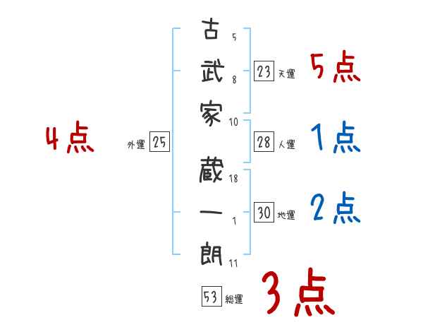 天運![]() | 古武家蔵一朗さんの天運は23画の5つ星!想像力に優れ活力がある。一代で成功し名誉を手に入れる。 家系が持つ宿命的な運勢を表します。祖先から受け継いだ苗字ですので自分の力が及びません。家柄を象徴します。 |