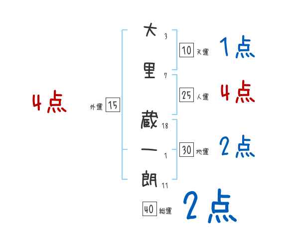 天運![]() | 大里蔵一朗さんの天運は10画の1つ星!不安を感じやすい傾向。ストレスを抱えないように注意しましょう。 家系が持つ宿命的な運勢を表します。祖先から受け継いだ苗字ですので自分の力が及びません。家柄を象徴します。 |