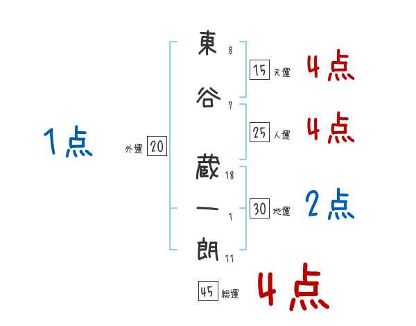 総運![]() | 東谷蔵一朗さんの総運は45画の4つ星!もくもくと物事を進め達成する。地味な努力家。 あなたの人生を表す1番重要な運勢です。生涯を通じて影響する総合運となり、主に50歳以降の晩年期に影響を及ぼします。 |