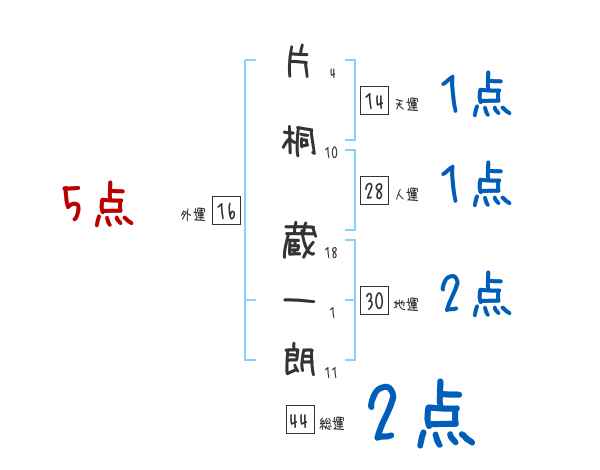 外運![]() | 片桐蔵一朗さんの外運は16画の5つ星!人望が厚く大きく発展する。逆転成功が見える。 生活面を象徴する運勢です。外部から受ける影響力を表し、結婚運、家庭運や職場、環境への順応性を表します。 |