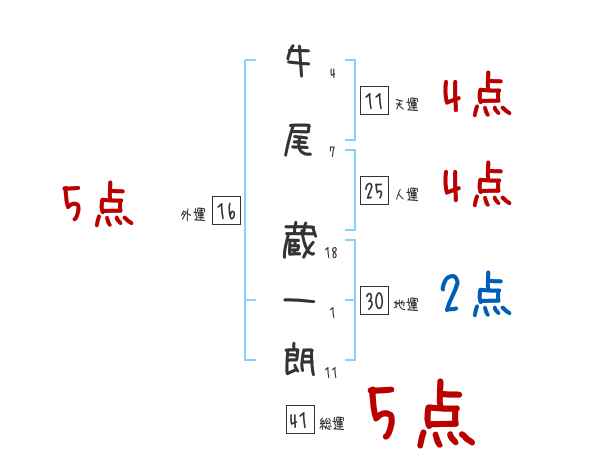 外運![]() | 牛尾蔵一朗さんの外運は16画の5つ星!人望が厚く大きく発展する。逆転成功が見える。 生活面を象徴する運勢です。外部から受ける影響力を表し、結婚運、家庭運や職場、環境への順応性を表します。 |