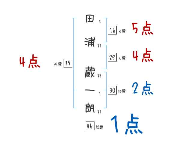 外運![]() | 田浦蔵一朗さんの外運は17画の4つ星!積極的な行動力。地位を気づき財産を手に入れる。純粋な心と直感力。 生活面を象徴する運勢です。外部から受ける影響力を表し、結婚運、家庭運や職場、環境への順応性を表します。 |