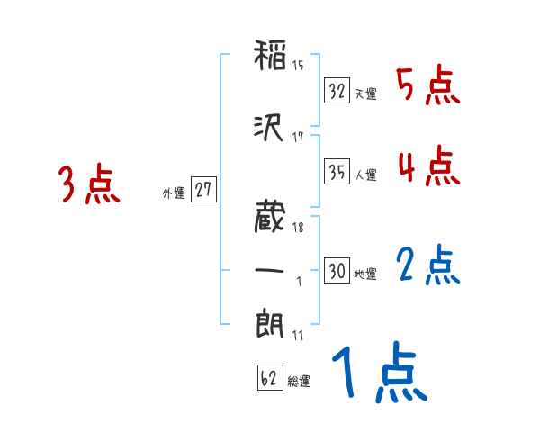 天運![]() | 稲沢蔵一朗さんの天運は32画の5つ星!柔軟性があり成功する。チャンスが多く金運が良い。 家系が持つ宿命的な運勢を表します。祖先から受け継いだ苗字ですので自分の力が及びません。家柄を象徴します。 |