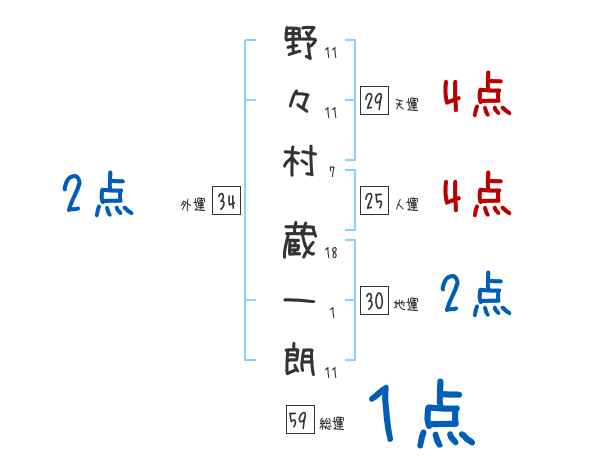 天運![]() | 野々村蔵一朗さんの天運は29画の4つ星!完全主義で才能がある。厳格な心の持ち主。 家系が持つ宿命的な運勢を表します。祖先から受け継いだ苗字ですので自分の力が及びません。家柄を象徴します。 |