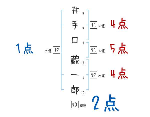 天運![]() | 井手口蔵一郎さんの天運は11画の4つ星!着実に富や地位を得る幸運な人生。 家系が持つ宿命的な運勢を表します。祖先から受け継いだ苗字ですので自分の力が及びません。家柄を象徴します。 |