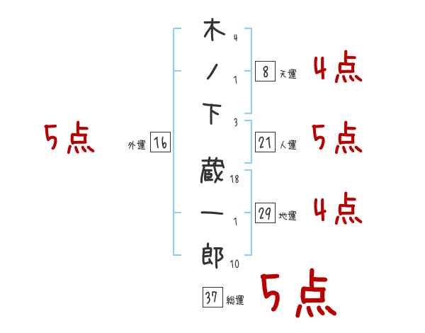 人運![]() | 木ノ下蔵一郎さんの人運は21画の5つ星!統率力がある。独立し成功する。名誉を手に入れる。 性格や才能などを表す2番目に重要な運勢です。人間関係や協調性、社会的な成功に影響します。主に20歳から50歳ぐらいまでの中年期の運勢を表します。 |
