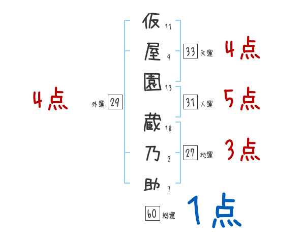 天運![]() | 仮屋園蔵乃助さんの天運は33画の4つ星!権力志向でプライドが高い。勇気があり運を切り開き成功する。 家系が持つ宿命的な運勢を表します。祖先から受け継いだ苗字ですので自分の力が及びません。家柄を象徴します。 |