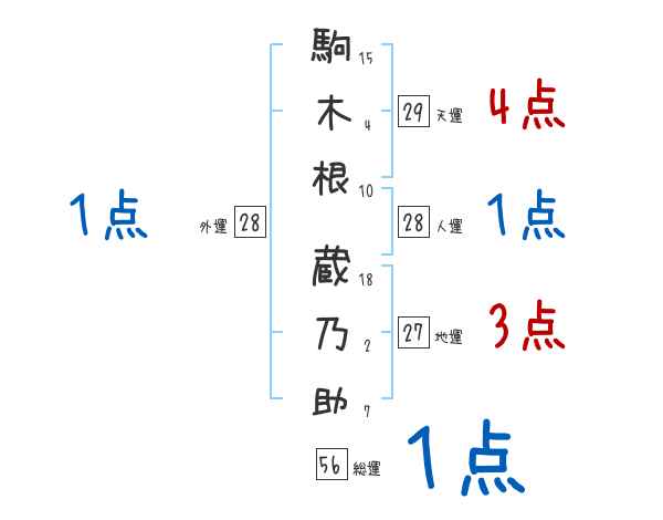 天運![]() | 駒木根蔵乃助さんの天運は29画の4つ星!完全主義で才能がある。厳格な心の持ち主。 家系が持つ宿命的な運勢を表します。祖先から受け継いだ苗字ですので自分の力が及びません。家柄を象徴します。 |