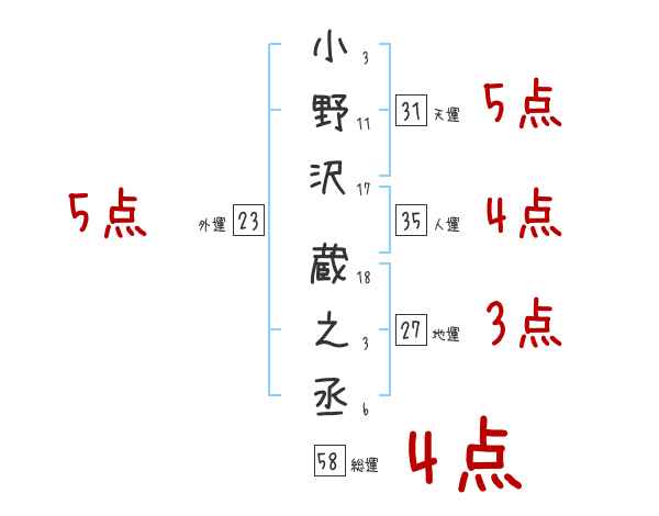 外運![]() | 小野沢蔵之丞さんの外運は23画の5つ星!想像力に優れ活力がある。一代で成功し名誉を手に入れる。 生活面を象徴する運勢です。外部から受ける影響力を表し、結婚運、家庭運や職場、環境への順応性を表します。 |