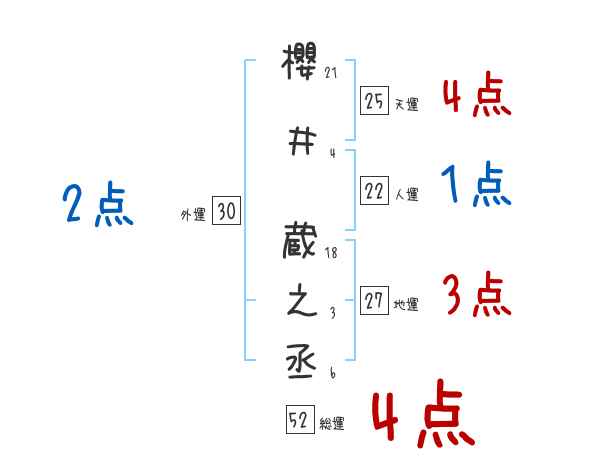 総運![]() | 櫻井蔵之丞さんの総運は52画の4つ星!先見性と独創性に優れ考える力がある。強運の持ち主。 あなたの人生を表す1番重要な運勢です。生涯を通じて影響する総合運となり、主に50歳以降の晩年期に影響を及ぼします。 |