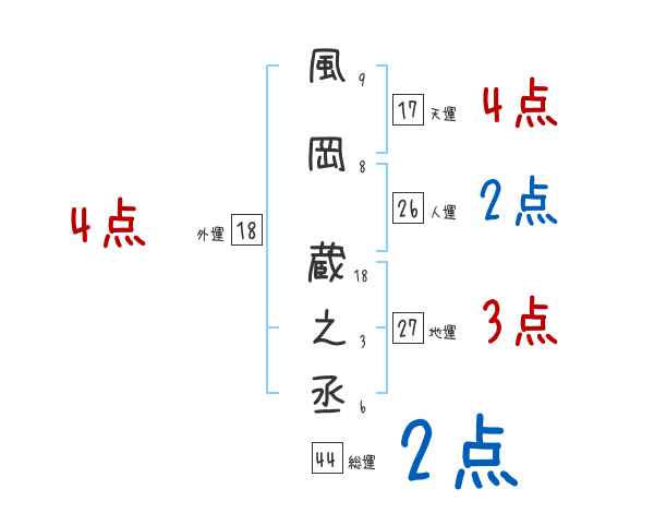 総運![]() | 風岡蔵之丞さんの総運は44画の2つ星!誠実で慎重な性格。物事を考えすぎないように注意しましょう。 あなたの人生を表す1番重要な運勢です。生涯を通じて影響する総合運となり、主に50歳以降の晩年期に影響を及ぼします。 |