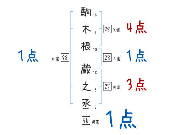 外運![]() | 駒木根蔵之丞さんの外運は28画の1つ星!家庭環境に注意。スポーツで活躍できる能力があるかも。 生活面を象徴する運勢です。外部から受ける影響力を表し、結婚運、家庭運や職場、環境への順応性を表します。 |