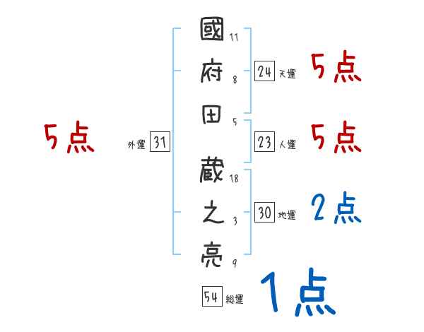 人運![]() | 國府田蔵之亮さんの人運は23画の5つ星!想像力に優れ活力がある。一代で成功し名誉を手に入れる。 性格や才能などを表す2番目に重要な運勢です。人間関係や協調性、社会的な成功に影響します。主に20歳から50歳ぐらいまでの中年期の運勢を表します。 |