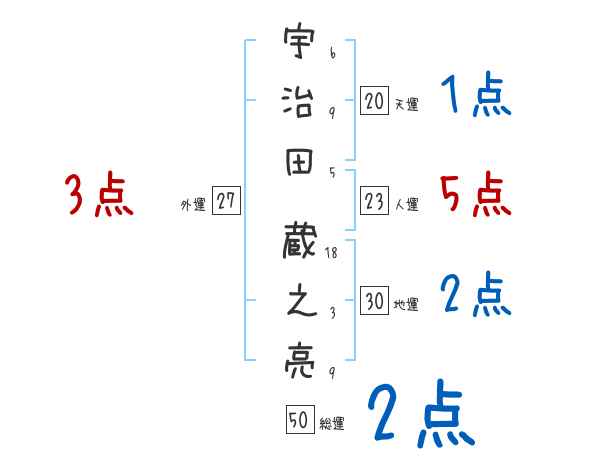 人運![]() | 宇治田蔵之亮さんの人運は23画の5つ星!想像力に優れ活力がある。一代で成功し名誉を手に入れる。 性格や才能などを表す2番目に重要な運勢です。人間関係や協調性、社会的な成功に影響します。主に20歳から50歳ぐらいまでの中年期の運勢を表します。 |