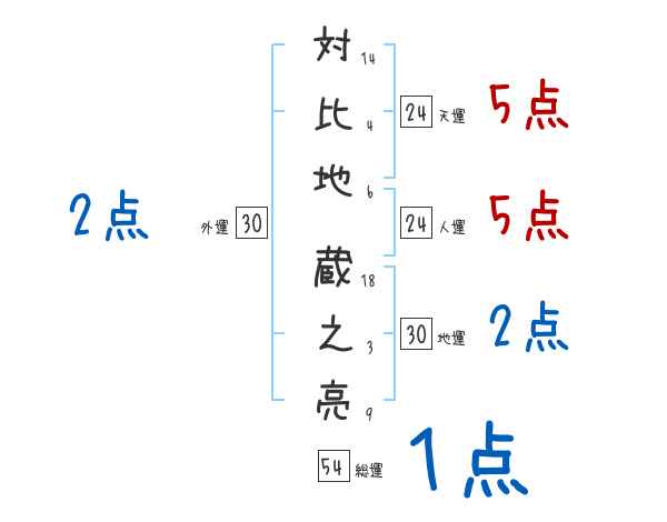 天運![]() | 対比地蔵之亮さんの天運は24画の5つ星!家庭運が良く順調な人生。金運にも恵まれる。 家系が持つ宿命的な運勢を表します。祖先から受け継いだ苗字ですので自分の力が及びません。家柄を象徴します。 |