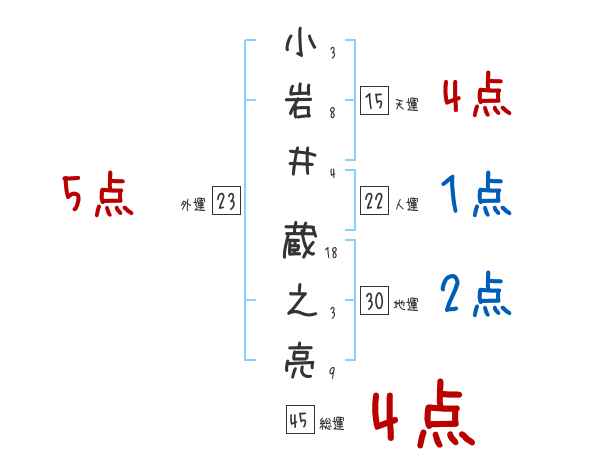 外運![]() | 小岩井蔵之亮さんの外運は23画の5つ星!想像力に優れ活力がある。一代で成功し名誉を手に入れる。 生活面を象徴する運勢です。外部から受ける影響力を表し、結婚運、家庭運や職場、環境への順応性を表します。 |