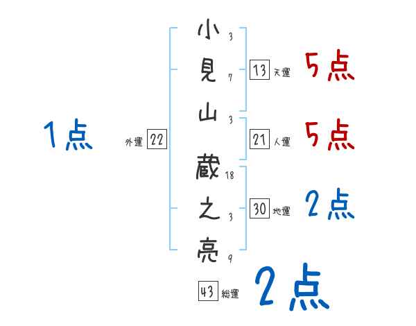 総運![]() | 小見山蔵之亮さんの総運は43画の2つ星!頑固な性格で独立心が強いかも。やや非現実的で浪費に注意しましょう。 あなたの人生を表す1番重要な運勢です。生涯を通じて影響する総合運となり、主に50歳以降の晩年期に影響を及ぼします。 |