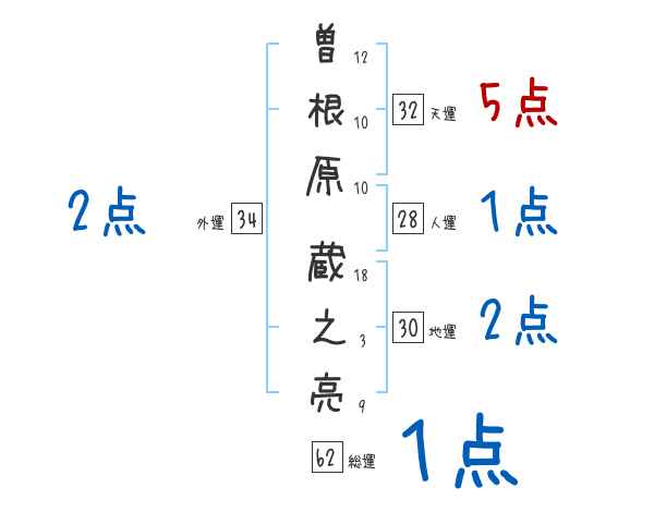 天運![]() | 曽根原蔵之亮さんの天運は32画の5つ星!柔軟性があり成功する。チャンスが多く金運が良い。 家系が持つ宿命的な運勢を表します。祖先から受け継いだ苗字ですので自分の力が及びません。家柄を象徴します。 |
