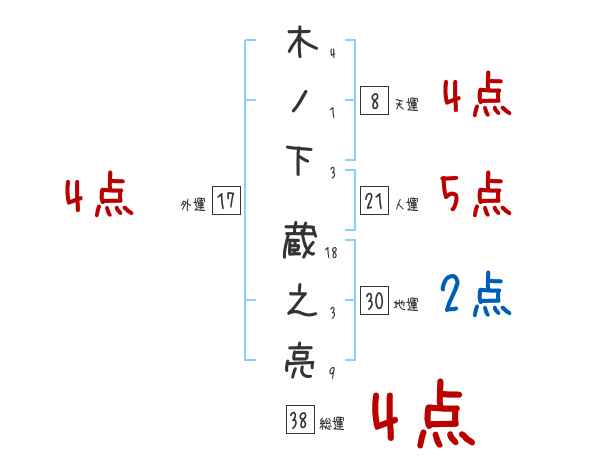 外運![]() | 木ノ下蔵之亮さんの外運は17画の4つ星!積極的な行動力。地位を気づき財産を手に入れる。純粋な心と直感力。 生活面を象徴する運勢です。外部から受ける影響力を表し、結婚運、家庭運や職場、環境への順応性を表します。 |