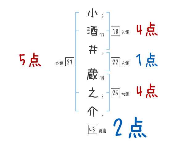 外運![]() | 小酒井蔵之介さんの外運は21画の5つ星!統率力がある。独立し成功する。名誉を手に入れる。 生活面を象徴する運勢です。外部から受ける影響力を表し、結婚運、家庭運や職場、環境への順応性を表します。 |