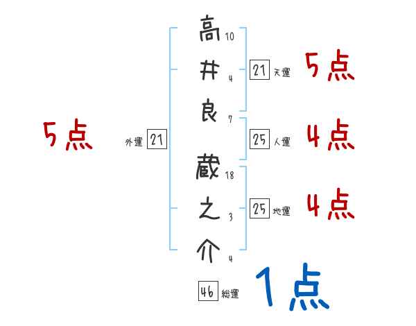 天運![]() | 高井良蔵之介さんの天運は21画の5つ星!統率力がある。独立し成功する。名誉を手に入れる。 家系が持つ宿命的な運勢を表します。祖先から受け継いだ苗字ですので自分の力が及びません。家柄を象徴します。 |