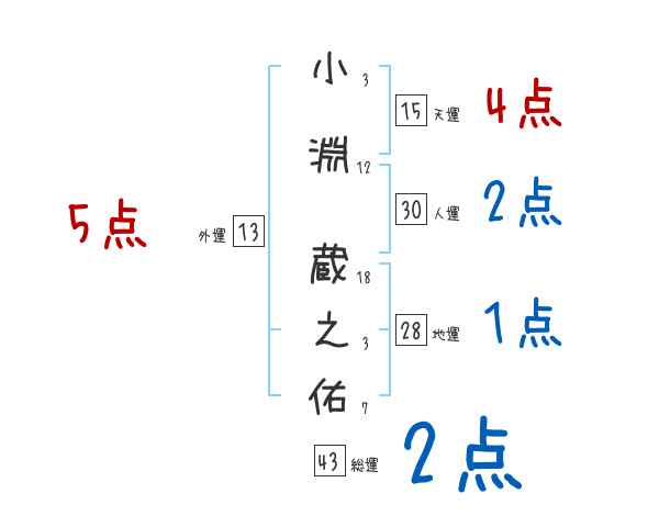 天運![]() | 小淵蔵之佑さんの天運は15画の4つ星!人徳があり出世する。順調に物事を進め円満な人生。 家系が持つ宿命的な運勢を表します。祖先から受け継いだ苗字ですので自分の力が及びません。家柄を象徴します。 |