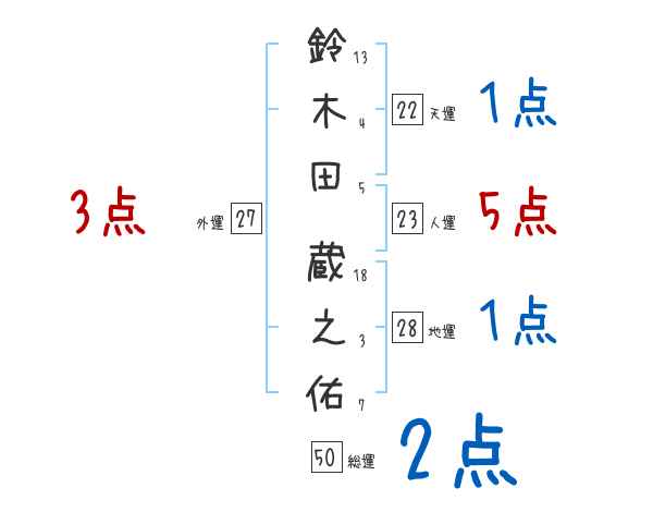 外運![]() | 鈴木田蔵之佑さんの外運は27画の3つ星!頭脳明晰だが強情で摩擦が多い傾向。孤立に注意。 生活面を象徴する運勢です。外部から受ける影響力を表し、結婚運、家庭運や職場、環境への順応性を表します。 |