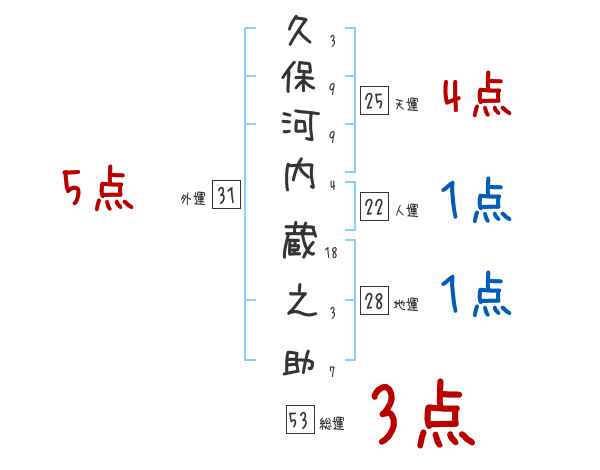 総運![]() | 久保河内蔵之助さんの総運は53画の3つ星!やや見栄っ張りで虚栄心がある。散財に注意。 あなたの人生を表す1番重要な運勢です。生涯を通じて影響する総合運となり、主に50歳以降の晩年期に影響を及ぼします。 |