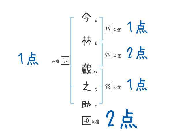 地運![]() | 今林蔵之助さんの地運は28画の1つ星!家庭環境に注意。スポーツで活躍できる能力があるかも。 個性を表す基礎的な運勢です。性格形成や対人関係、行動力など家庭環境に影響されます。主に誕生してから20歳くらいまでの若年期の運勢を表します。 |