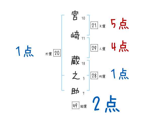 天運![]() | 宮﨑蔵之助さんの天運は21画の5つ星!統率力がある。独立し成功する。名誉を手に入れる。 家系が持つ宿命的な運勢を表します。祖先から受け継いだ苗字ですので自分の力が及びません。家柄を象徴します。 |