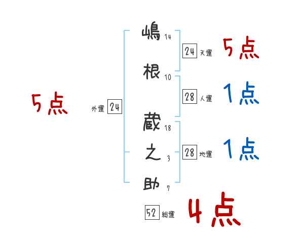 天運![]() | 嶋根蔵之助さんの天運は24画の5つ星!家庭運が良く順調な人生。金運にも恵まれる。 家系が持つ宿命的な運勢を表します。祖先から受け継いだ苗字ですので自分の力が及びません。家柄を象徴します。 |
