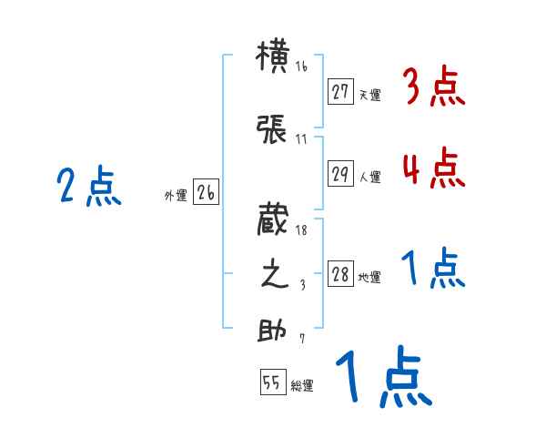 天運![]() | 横張蔵之助さんの天運は27画の3つ星!頭脳明晰だが強情で摩擦が多い傾向。孤立に注意。 家系が持つ宿命的な運勢を表します。祖先から受け継いだ苗字ですので自分の力が及びません。家柄を象徴します。 |