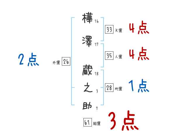 地運![]() | 樺澤蔵之助さんの地運は28画の1つ星!家庭環境に注意。スポーツで活躍できる能力があるかも。 個性を表す基礎的な運勢です。性格形成や対人関係、行動力など家庭環境に影響されます。主に誕生してから20歳くらいまでの若年期の運勢を表します。 |