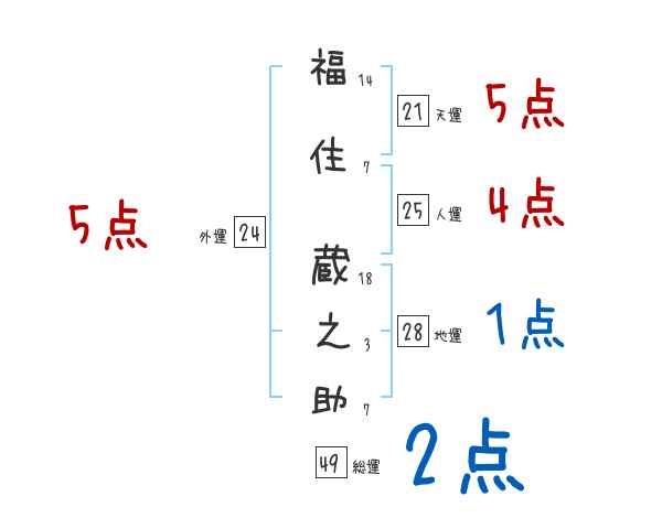 外運![]() | 福住蔵之助さんの外運は24画の5つ星!家庭運が良く順調な人生。金運にも恵まれる。 生活面を象徴する運勢です。外部から受ける影響力を表し、結婚運、家庭運や職場、環境への順応性を表します。 |
