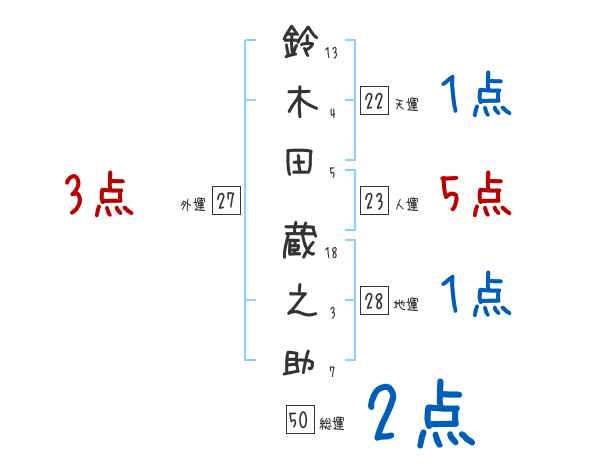 人運![]() | 鈴木田蔵之助さんの人運は23画の5つ星!想像力に優れ活力がある。一代で成功し名誉を手に入れる。 性格や才能などを表す2番目に重要な運勢です。人間関係や協調性、社会的な成功に影響します。主に20歳から50歳ぐらいまでの中年期の運勢を表します。 |