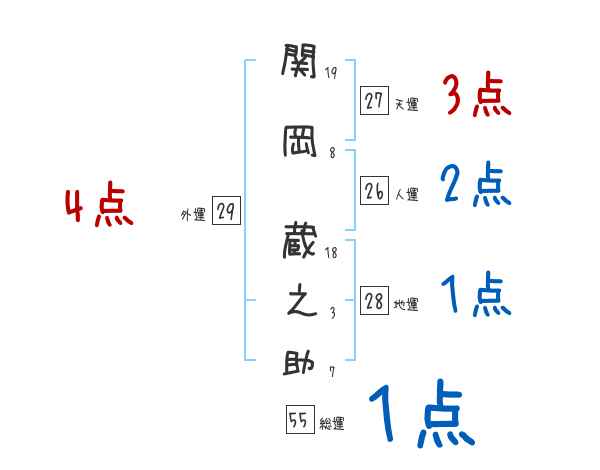 外運![]() | 関岡蔵之助さんの外運は29画の4つ星!完全主義で才能がある。厳格な心の持ち主。 生活面を象徴する運勢です。外部から受ける影響力を表し、結婚運、家庭運や職場、環境への順応性を表します。 |