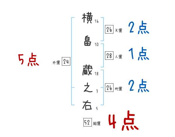外運![]() | 横畠蔵之右さんの外運は24画の5つ星!家庭運が良く順調な人生。金運にも恵まれる。 生活面を象徴する運勢です。外部から受ける影響力を表し、結婚運、家庭運や職場、環境への順応性を表します。 |
