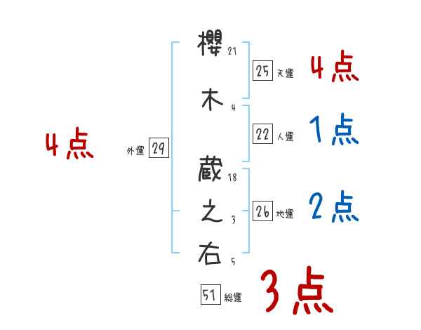 天運![]() | 櫻木蔵之右さんの天運は25画の4つ星!個性があり才能があふれる。強運の持ち主で発展する。 家系が持つ宿命的な運勢を表します。祖先から受け継いだ苗字ですので自分の力が及びません。家柄を象徴します。 |