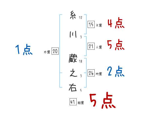 人運![]() | 糸川蔵之右さんの人運は21画の5つ星!統率力がある。独立し成功する。名誉を手に入れる。 性格や才能などを表す2番目に重要な運勢です。人間関係や協調性、社会的な成功に影響します。主に20歳から50歳ぐらいまでの中年期の運勢を表します。 |
