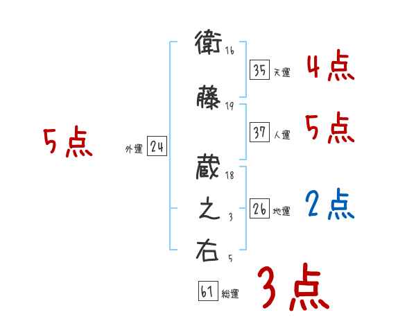 天運![]() | 衛藤蔵之右さんの天運は35画の4つ星!温厚な性格で感受性が高い。穏和な性格で人望が厚い。 家系が持つ宿命的な運勢を表します。祖先から受け継いだ苗字ですので自分の力が及びません。家柄を象徴します。 |