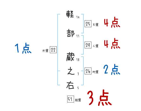 外運![]() | 軽部蔵之右さんの外運は22画の1つ星!努力することが苦手ないっぽう手先が器用。芸術性にも優れる。 生活面を象徴する運勢です。外部から受ける影響力を表し、結婚運、家庭運や職場、環境への順応性を表します。 |