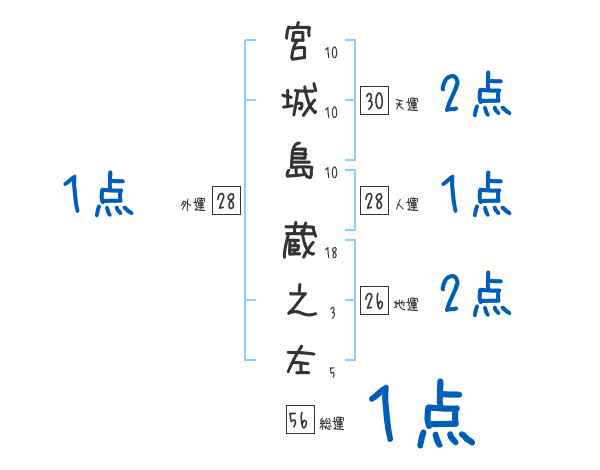 人運![]() | 宮城島蔵之左さんの人運は28画の1つ星!家庭環境に注意。スポーツで活躍できる能力があるかも。 性格や才能などを表す2番目に重要な運勢です。人間関係や協調性、社会的な成功に影響します。主に20歳から50歳ぐらいまでの中年期の運勢を表します。 |