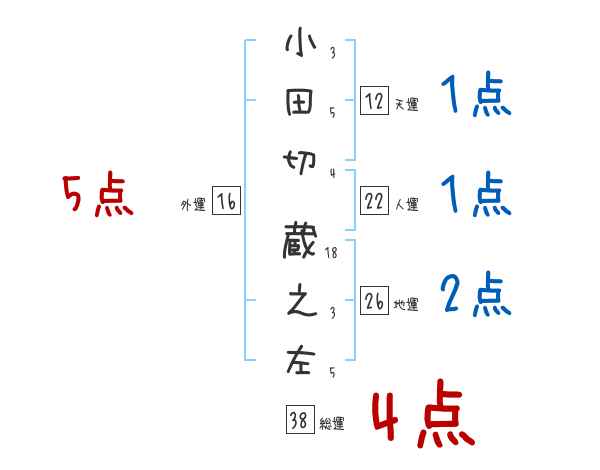 外運![]()  | 小田切蔵之左さんの外運は16画の5つ星!人望が厚く大きく発展する。逆転成功が見える。 生活面を象徴する運勢です。外部から受ける影響力を表し、結婚運、家庭運や職場、環境への順応性を表します。 |