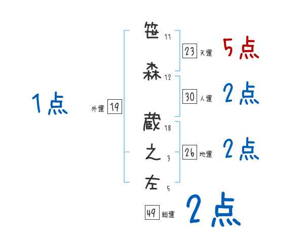天運![]() | 笹森蔵之左さんの天運は23画の5つ星!想像力に優れ活力がある。一代で成功し名誉を手に入れる。 家系が持つ宿命的な運勢を表します。祖先から受け継いだ苗字ですので自分の力が及びません。家柄を象徴します。 |