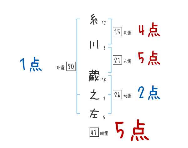 人運![]() | 糸川蔵之左さんの人運は21画の5つ星!統率力がある。独立し成功する。名誉を手に入れる。 性格や才能などを表す2番目に重要な運勢です。人間関係や協調性、社会的な成功に影響します。主に20歳から50歳ぐらいまでの中年期の運勢を表します。 |