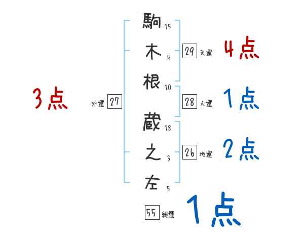 天運![]() | 駒木根蔵之左さんの天運は29画の4つ星!完全主義で才能がある。厳格な心の持ち主。 家系が持つ宿命的な運勢を表します。祖先から受け継いだ苗字ですので自分の力が及びません。家柄を象徴します。 |