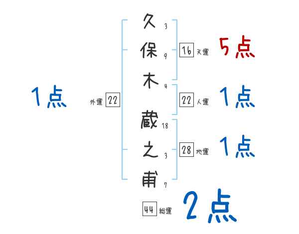 外運![]() | 久保木蔵之甫さんの外運は22画の1つ星!努力することが苦手ないっぽう手先が器用。芸術性にも優れる。 生活面を象徴する運勢です。外部から受ける影響力を表し、結婚運、家庭運や職場、環境への順応性を表します。 |